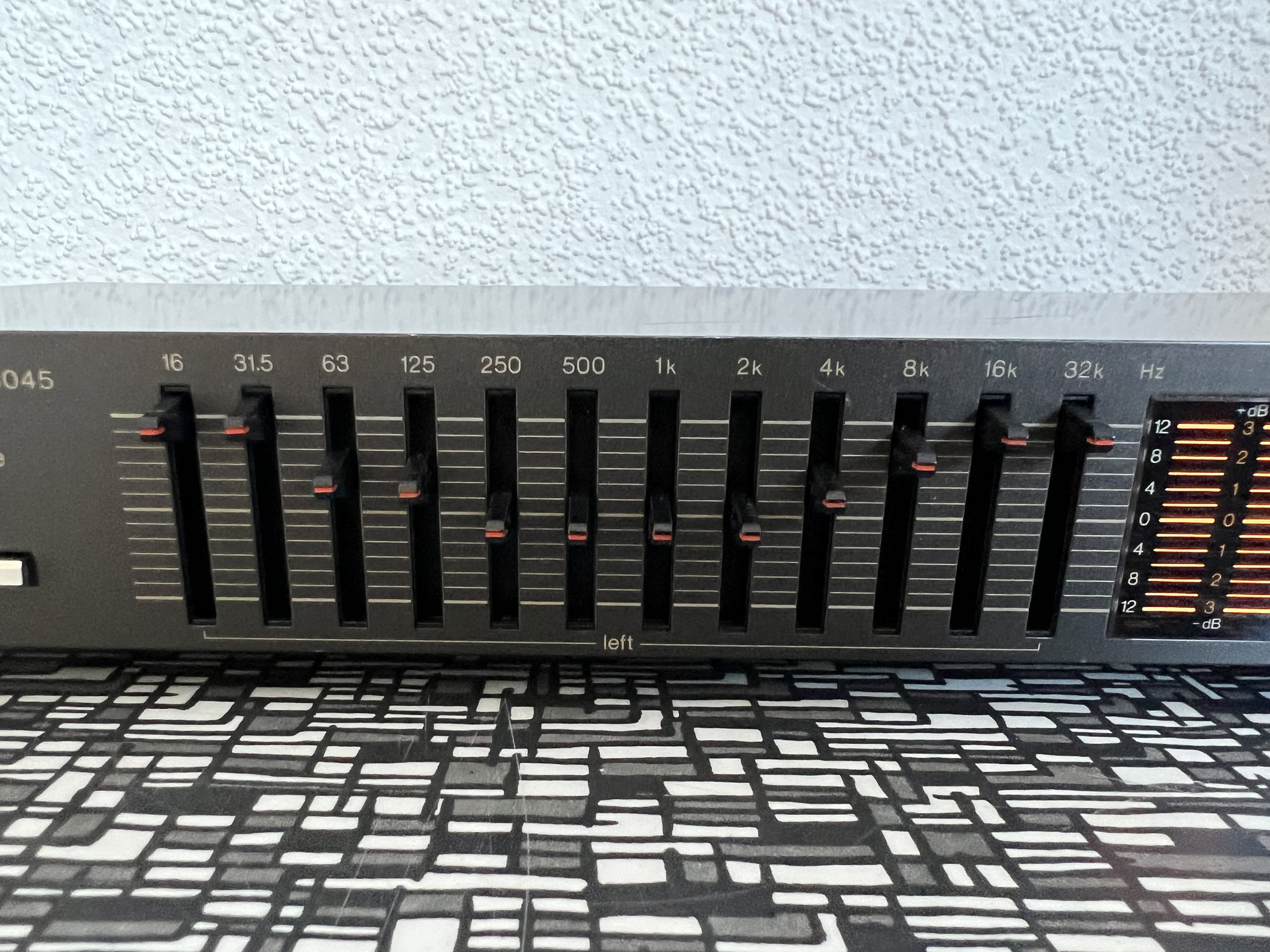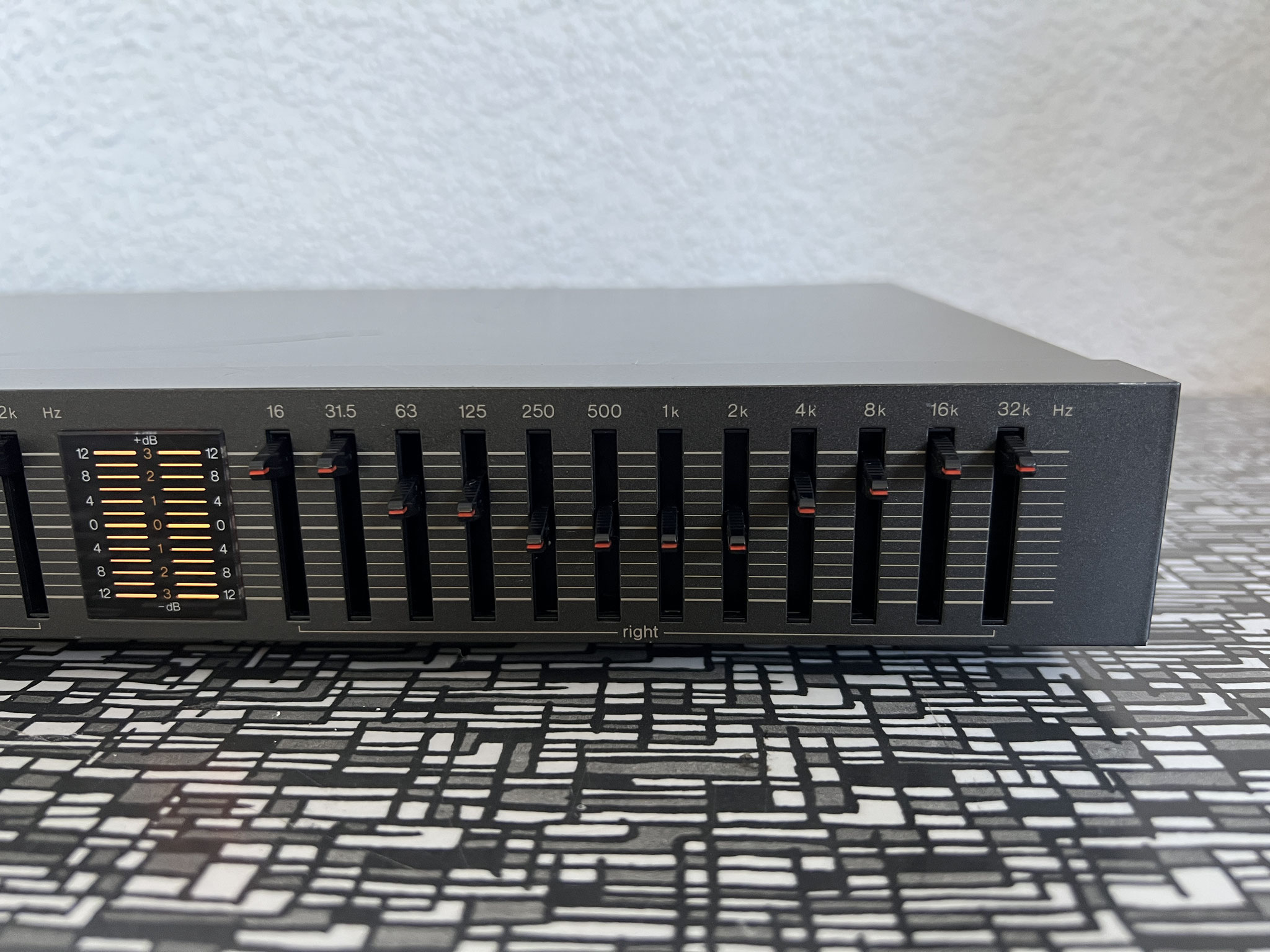 Klassischer Hi-Fi Equalizer mit je 12 Frequenzbändern. Weitere Ausstattung: 2 Einstellbereiche umschaltbar, Tape-Monitor, Rec-Monitor, EQ On/Off, beleuchtete Skala. Technisch in Topzustand, leichte altersbedingte Gebrauchsspuren.