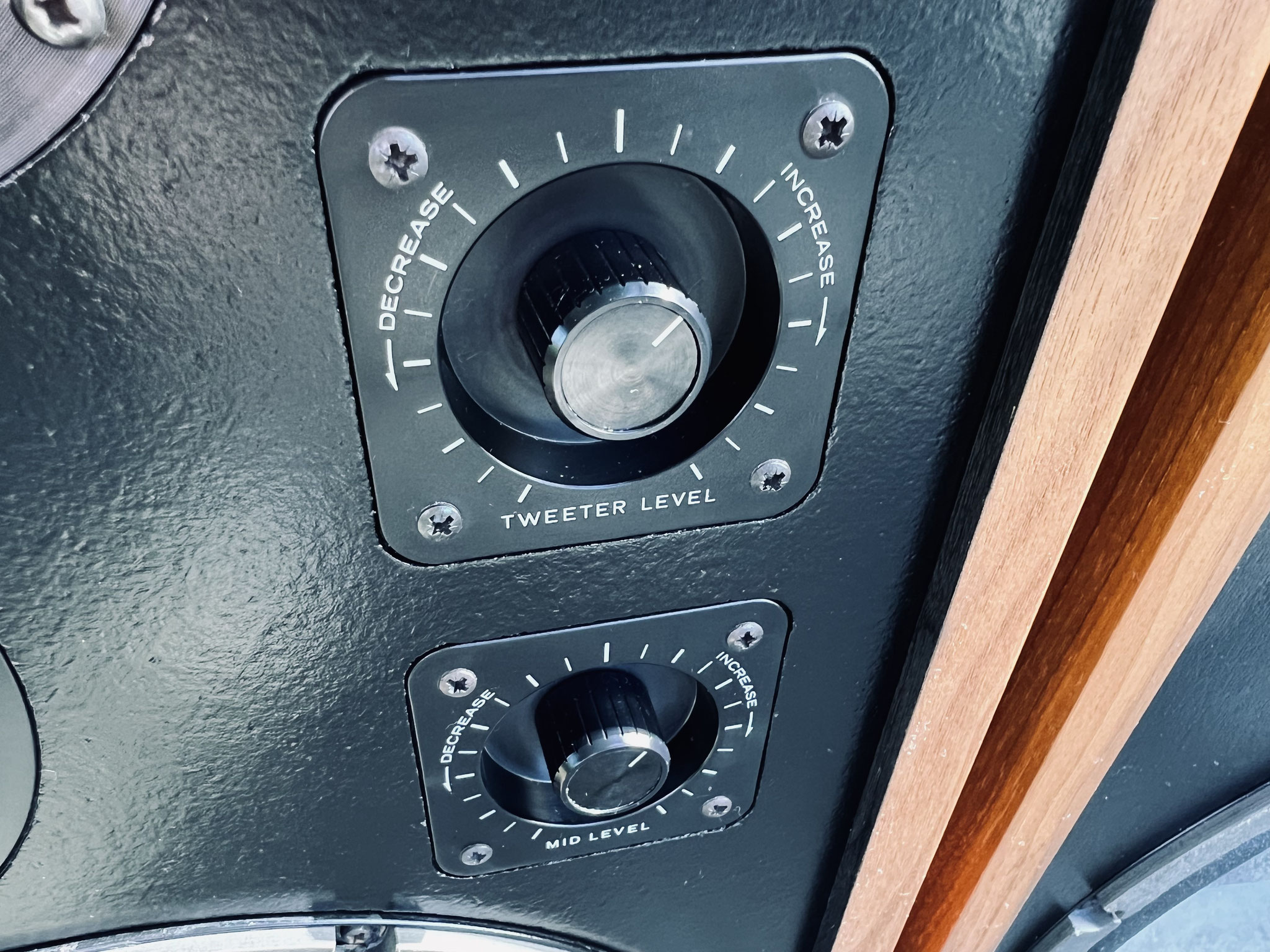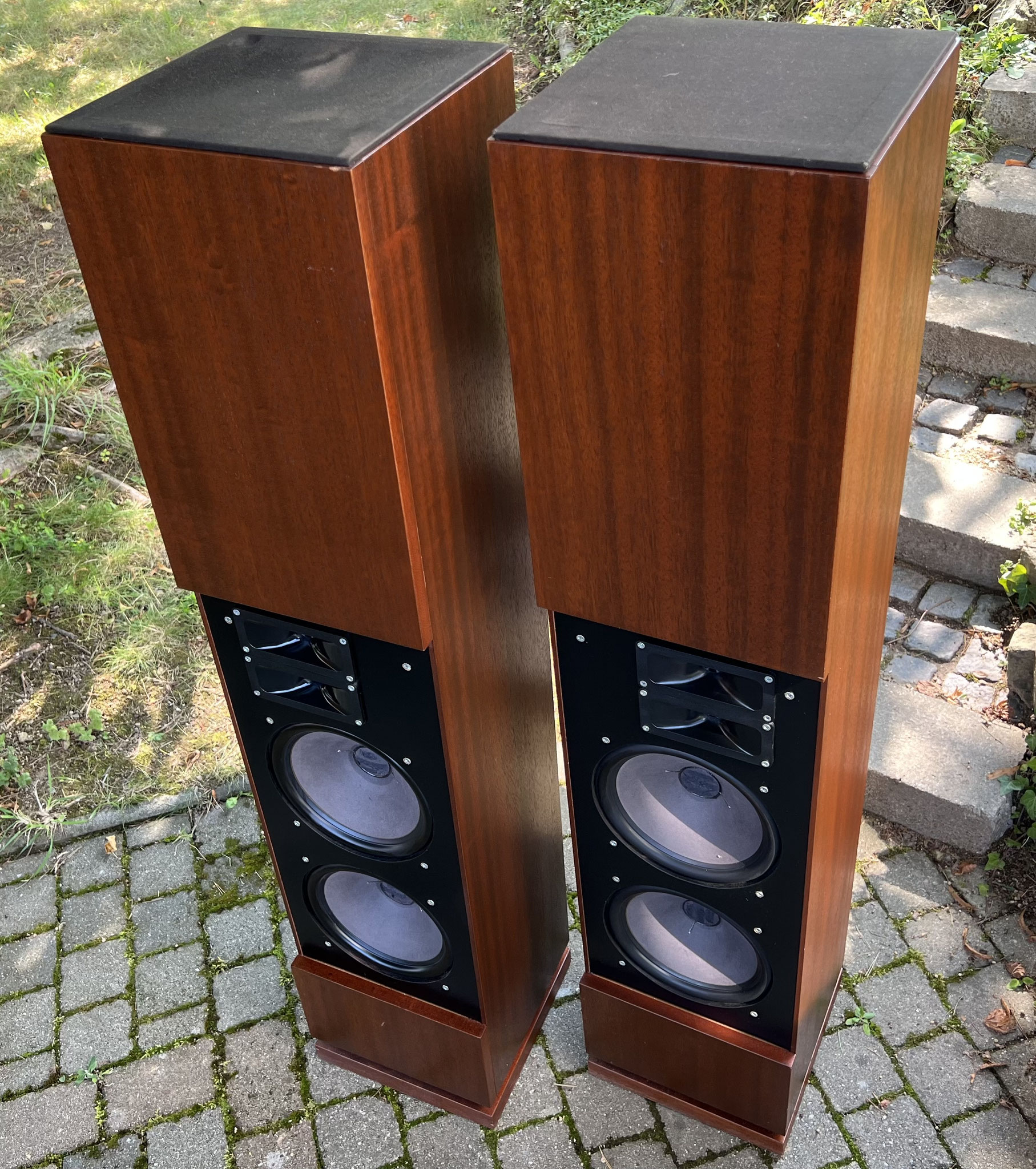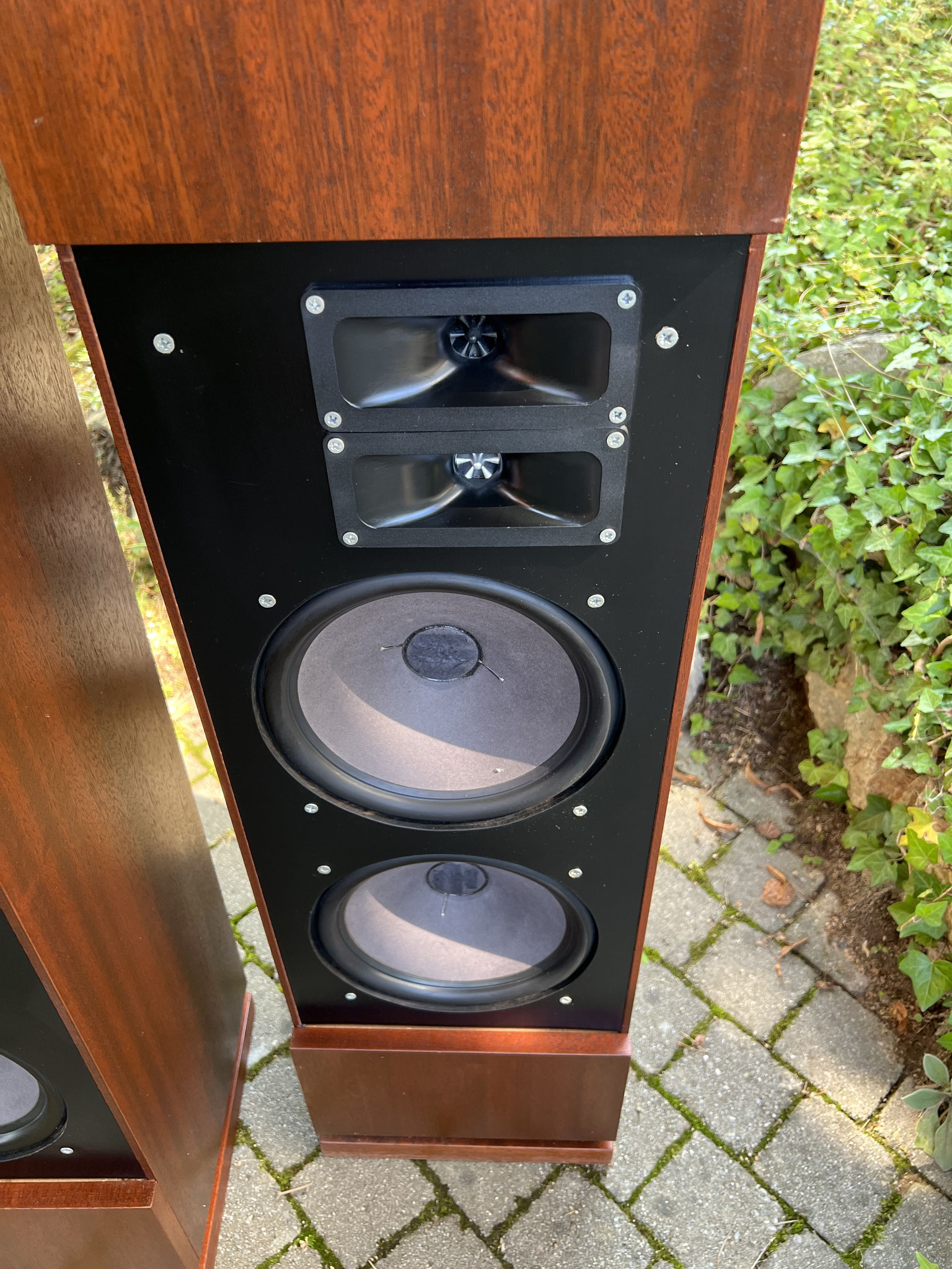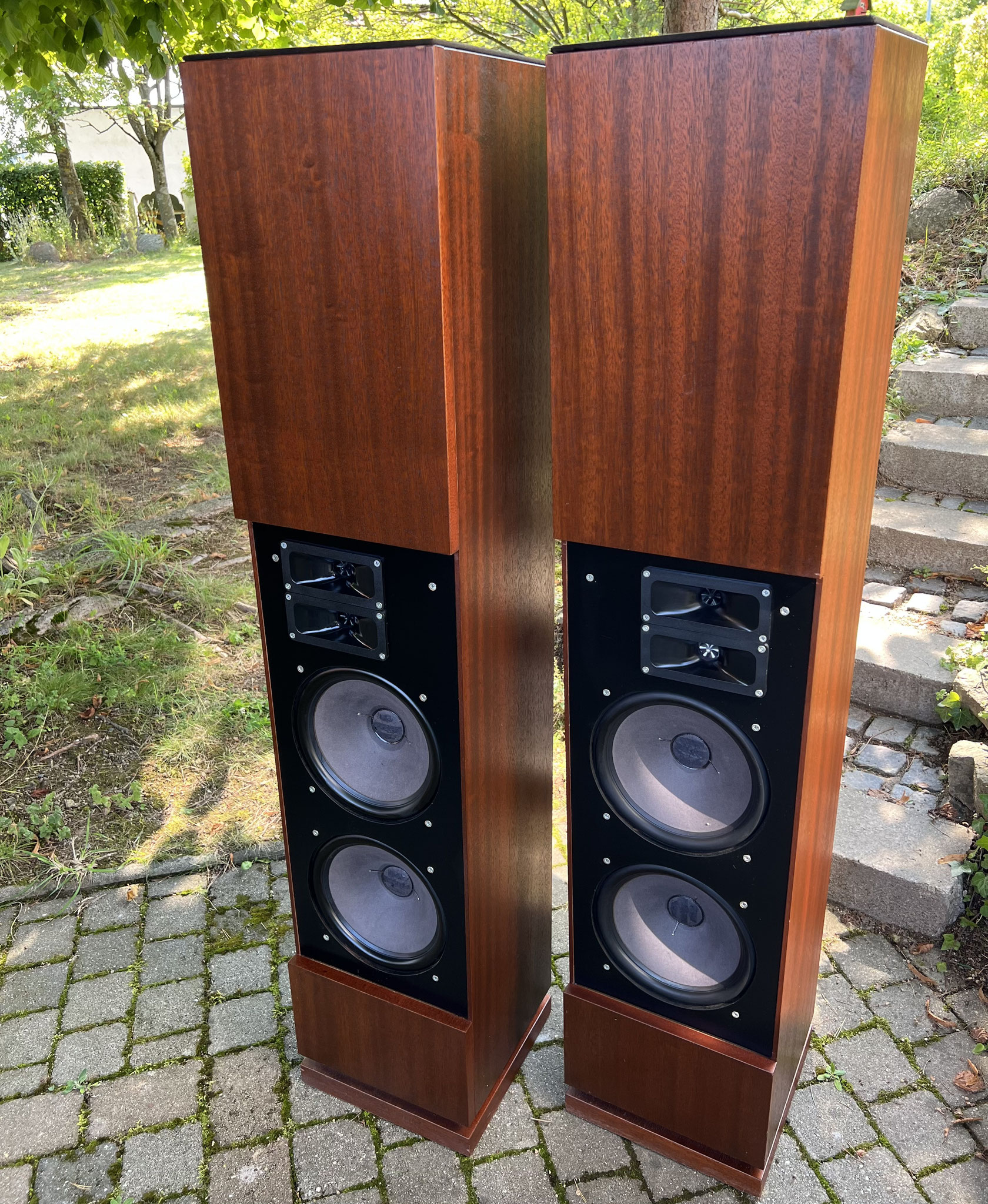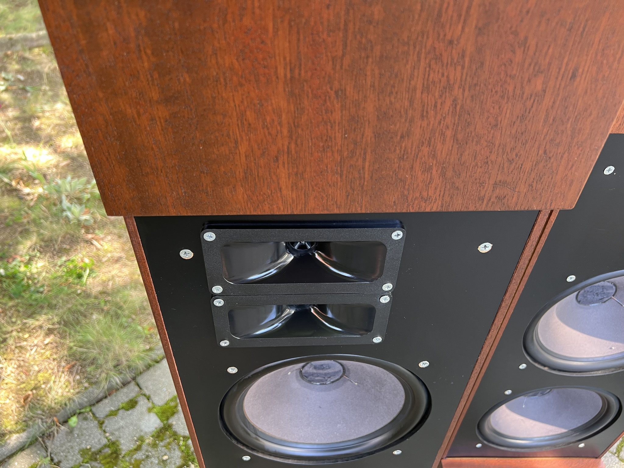 Großartig klingender und druckvoller 3-Wege Baßreflex-Lautsprecher mit Mehrkammer Mitteltonhorn und Horn-Hochtöner. Pegelregler für Mitten und Höhen (Potis gereinigt), technisch top, optisch für das Alter ebenso. Merkmale: 3-Wege-System, Bassreflex front, 70 Watt, 660 x 400 x 317 mm (HxBxT), Gewicht 22,5 kg pro Stück