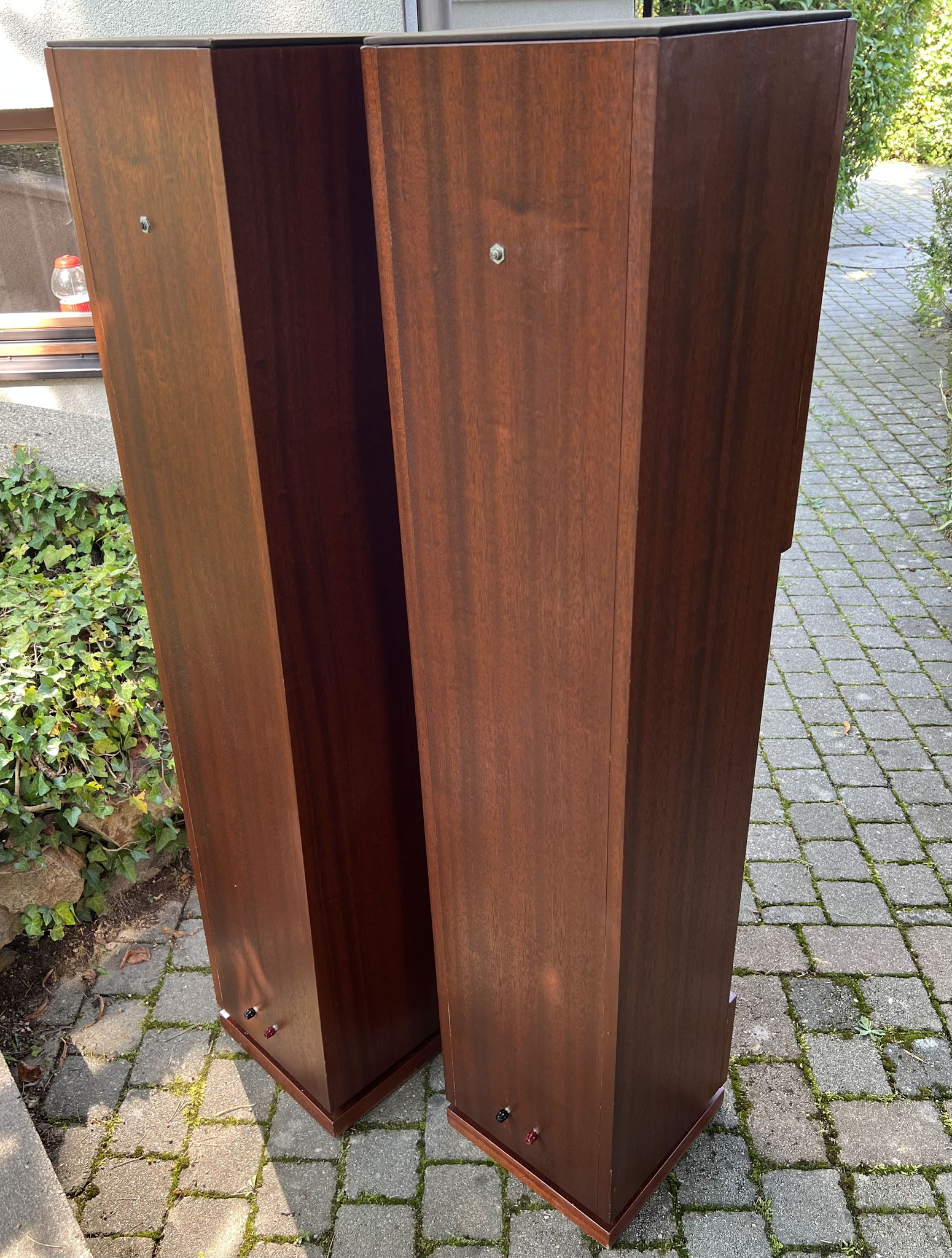 Standlautsprecher made in Austria. Echtholzfurnierte Gehäuse, Tieftonteil nach dem Orgelpfeifenprinzip konstruiert, Hochtonteil mit zwei Piezo-Hochtonhörnern, Abmessungen: 300 x 1.400 x 300 mm (B x H x T), seht guter Zustand, Abdeckungen sind verfügbar, aber nicht sonderlich schön (Bespannung)