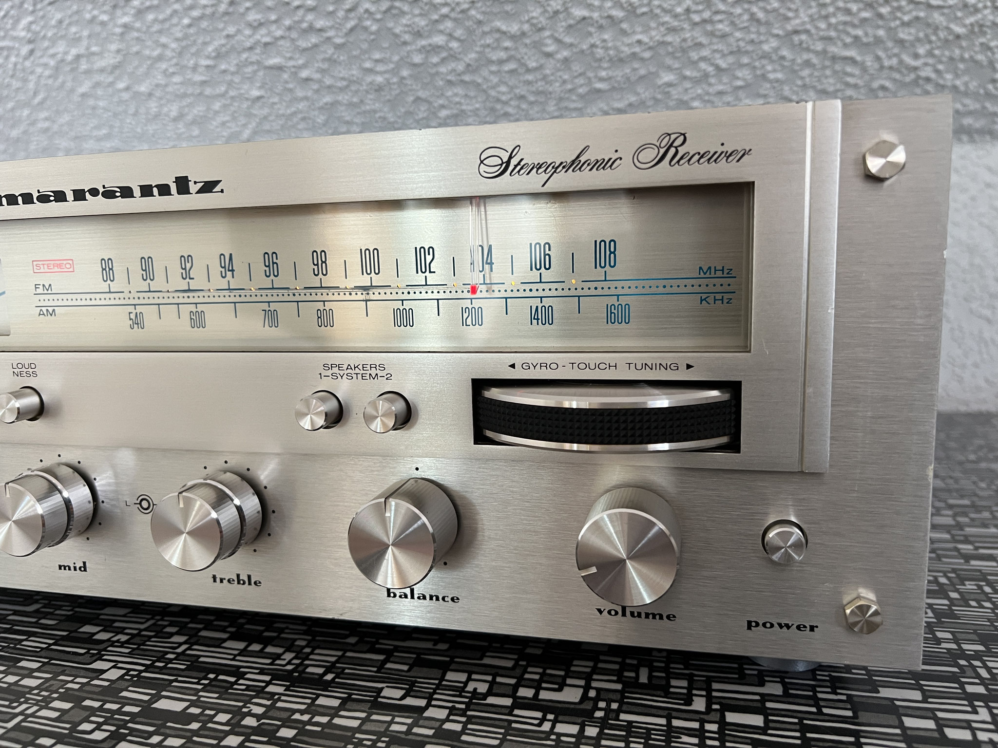 Wunderschön erhaltener Receiver von Marantz aus den späten 70-er Jahren. Das großartig designte und wohklingende Gerät verfügt über FM/AM Radioteil und Verstärker mit Anschlüssen für Palttenspieler und Tapedecks. Die wunderschön blau hinterleuchtete analoge Skala und die intuitiven Bedienungselemente zeichnen diesen Hi-Fi Klassiker aus. Top in technischem und optischem Zustand.